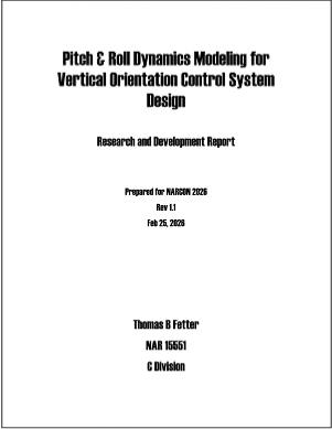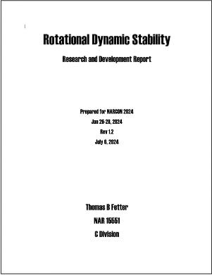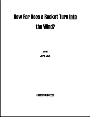 Along the way, I ran into questions that have resulted in a number of side investigations Topics have included rotational dynamic stability and why rockets are so stable, how far a rocket turns into the wind, and understanding the mechanisms of coning. I have written papers to document some of this work, and they are available below. I will continue to make these papers available here as I complete them.